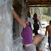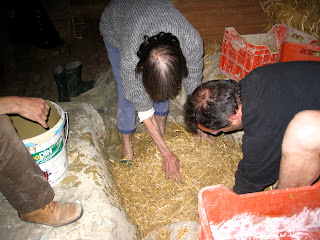 Stefano (a direita) permacultor, professor, construidor, inspirdor fazendo uma mistura d palha com barro e agua para preparar material para fazer uma parede interior